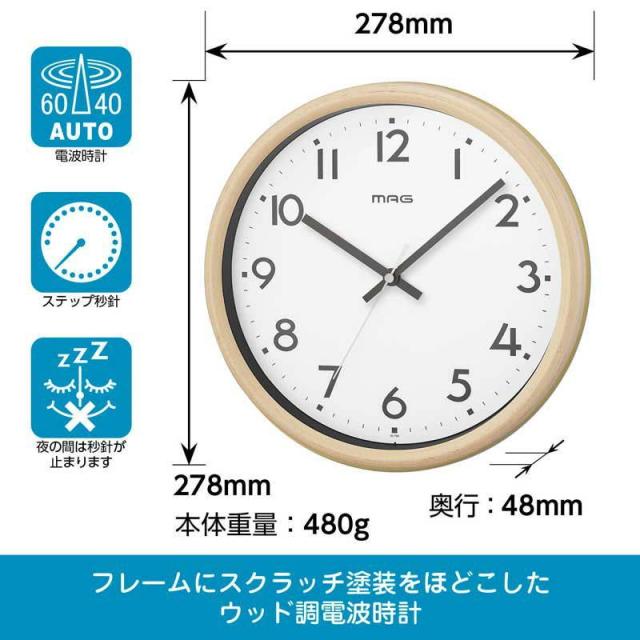 壁掛け時計 電波時計 ウォールクロック おしゃれ 木目調フレーム アナログ インテリア時計 直径27.8cm MAG トルテ ナチュラル