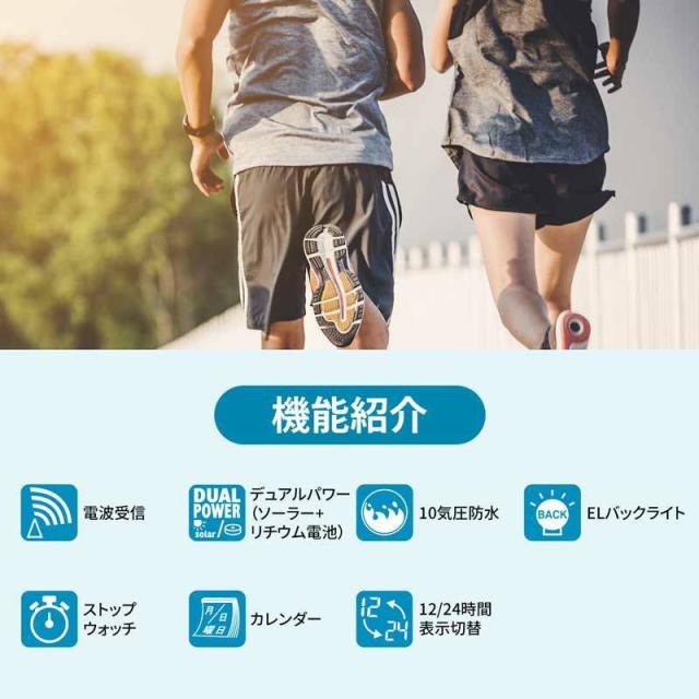 機能:電波時計、電波受信状況表示、報時機能、10気圧防水、デュアルパワー(ソーラー+リチウム電池駆動自動切替)、カレンダー表示、12/24時間表示切替、ストップウォッチ機能、カウントダウンタイマー
