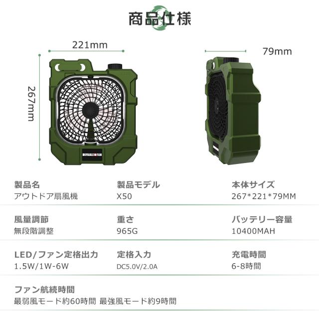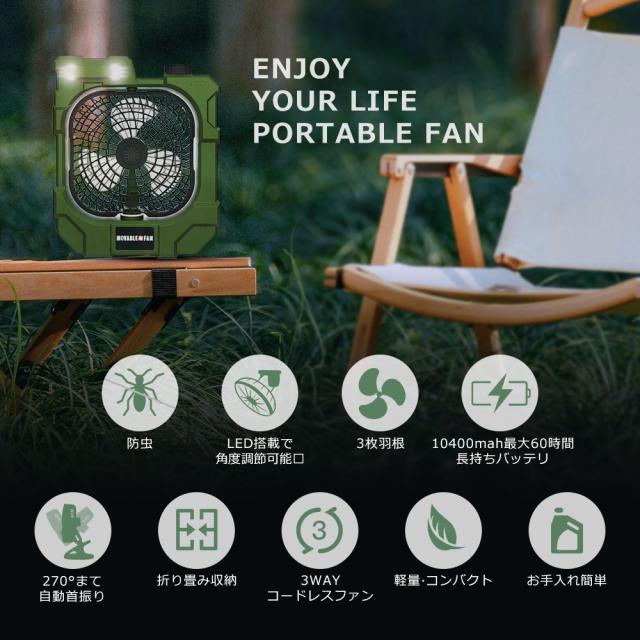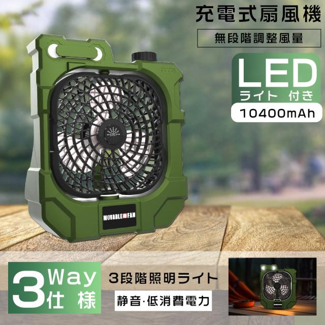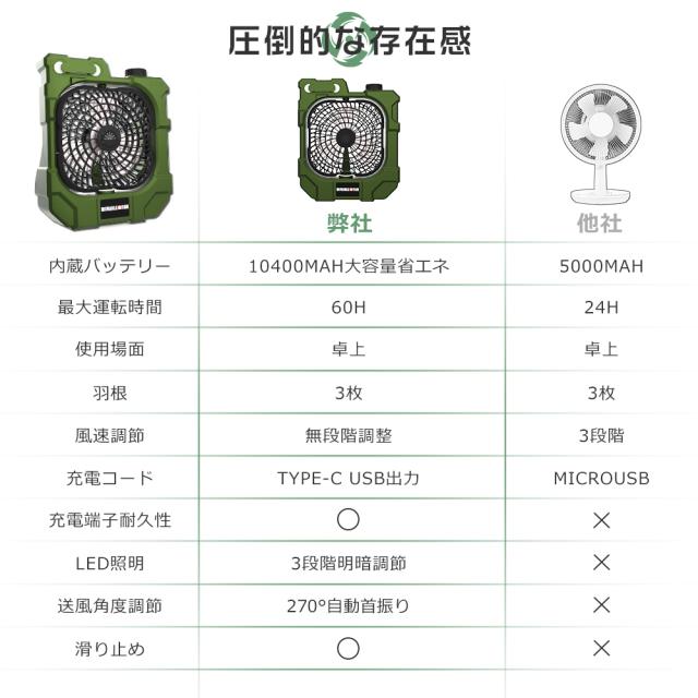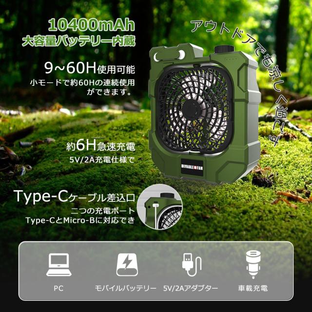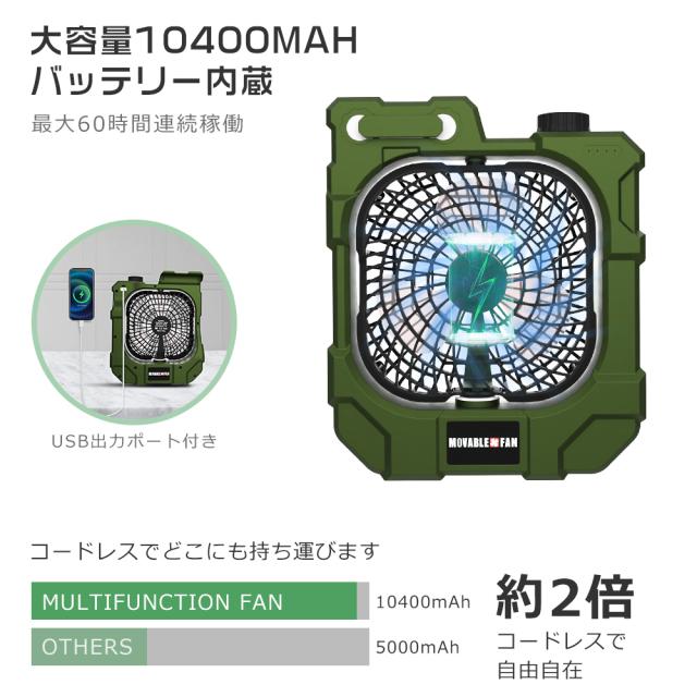 【10000mAh大容量電池&省エネ】コードレスで充電式キャンプ扇風機は、省エネ設計をしており、フル充電の場合、最小モードで約20時間の連続使用ができます。電池残量がすぐに確認できるLEDを搭載しています、タイムリーに電力補充を実現。