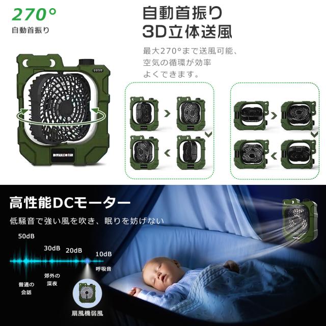 【無段階風量調節&自動首振り運転機能】KINGLEADキャンプ 扇風機、柔らかい自然な風を生む「3枚羽」で空気を細やかに切り、より肌あたりの優しい風が楽しめる。キャンプ 扇風機は自由自在の風量調節でき、ノブを回すと好みの風速を選べます、最適な快適性を実現!