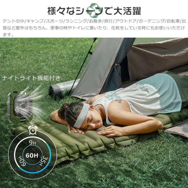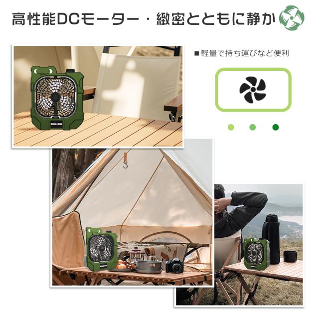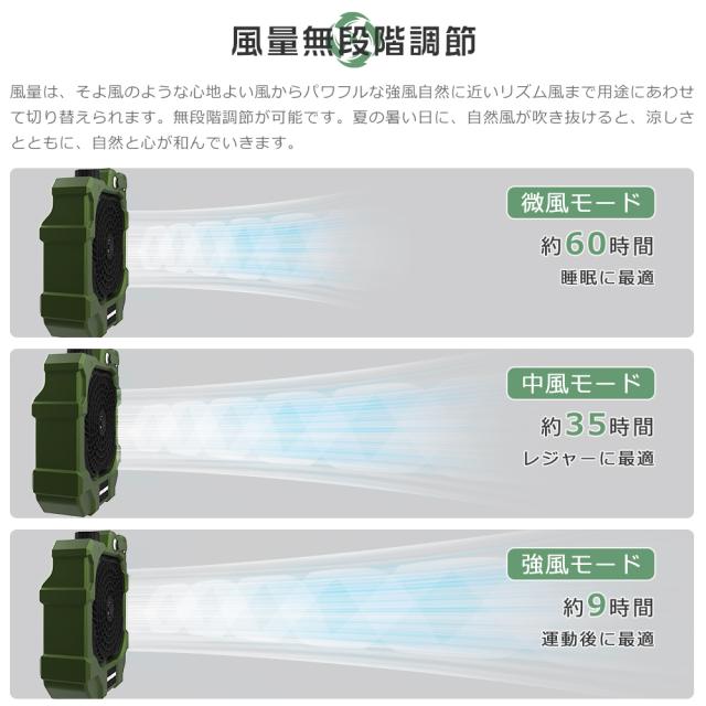 【3段階の調光モード&SOSモード】 アウトドア用扇風機はLEDライト搭載し、明るさは三段階で、様々なシーンにお好みに合わせて調整できる。低輝度モードは柔らかく、まぶしい光ではなく、読書や常夜灯として最適。高輝度モードはテント内を照らすことができ、キャンプ、ハイキング、その他の夜間のアウトドアアクティビティにも最適。※メジャー採寸の為、サイズが多少異なる場合がございます。予めご了承ください。