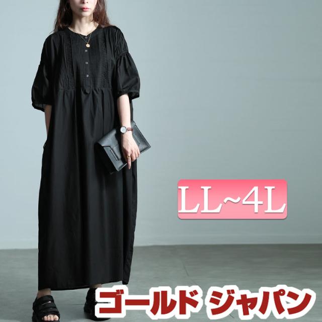 春新作 大きいサイズ レディース ワンピース インド綿ピンタックバルーンスリーブワンピース ワンピ ロングワンピース ロング マキシ 半袖 5分袖 ピンタック バルーン袖 パフスリーブ ギャザー ポケット ボタン 夏服 春服 秋服 LL 2L 3L 4L ブラック 黒 ゴールドジャパン