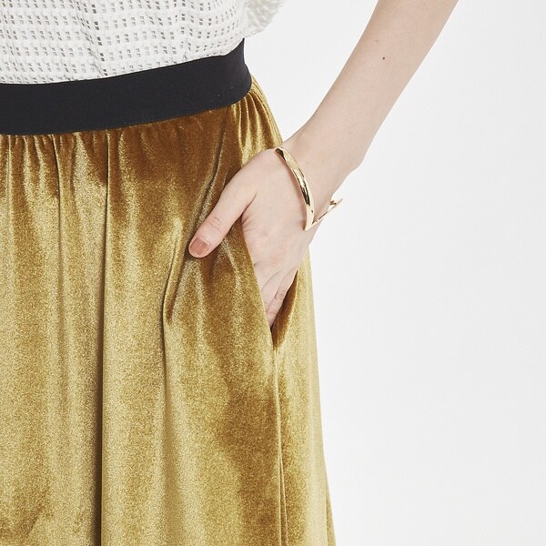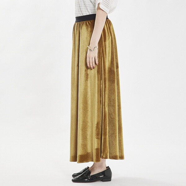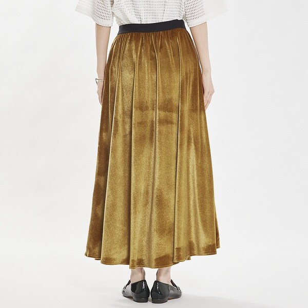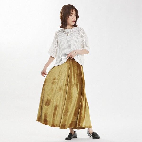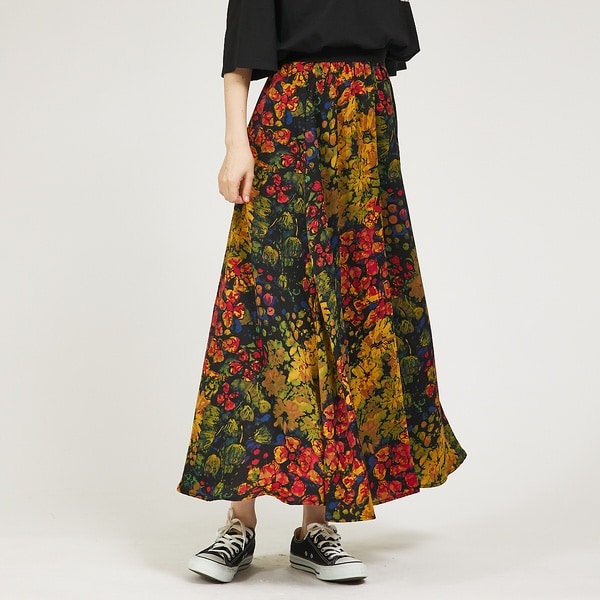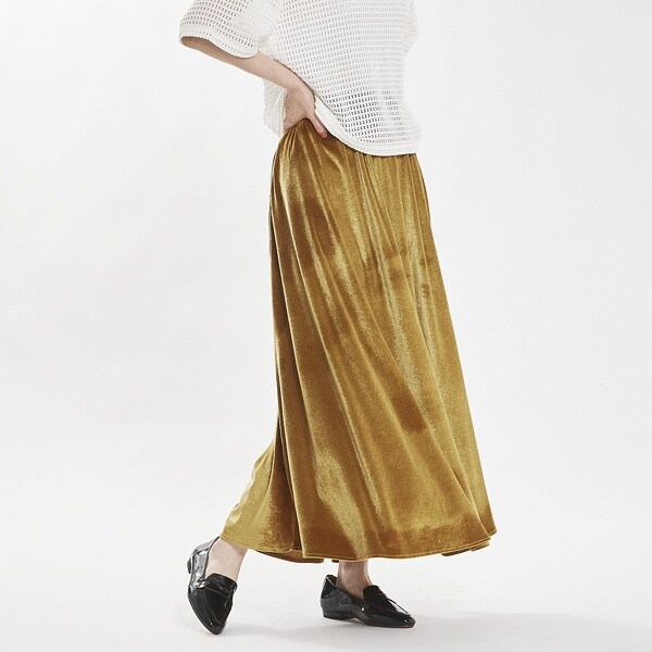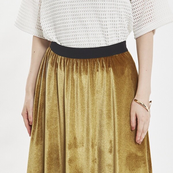 晩夏から秋にぴったりのシックなフラワープリントと冬にも映える上品な光沢のベロアスカート。落ち感のあるロングフレアーシルエットで高級感も◎。ウェストはゴム仕様になっているので着心地も楽ちんです。