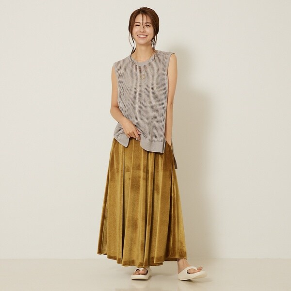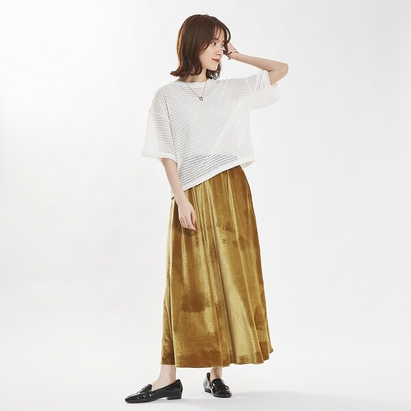 異素材感を意識して透け感アイテム×ベロアのコーデや、ニット×プリントの合わせなどおすすめ。ロングスカートにあえてルーズなトップス合わせならより旬なスタイリングに。