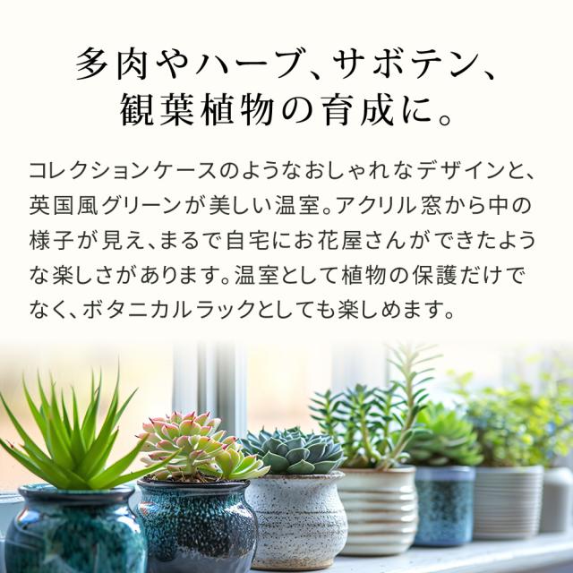 コレクションケースのようなおしゃれなデザインと、英国風グリーンが美しい温室。アクリル窓から中の様子が見え、自宅にお花屋さんができたような楽しさがあります。温室として植物の保護だけでなく、ボタニカルラックとしても楽しめます。