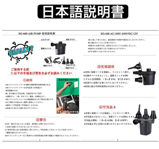 1. 電気ポンプをご使用の際、給排気口を塞いで使用しないでください。連続して20分以上使用しないでください。給排気口を塞いで使用した場合、ヒューズが切れ、 製品の破損や発火等の重大事故を起こす場合があります。