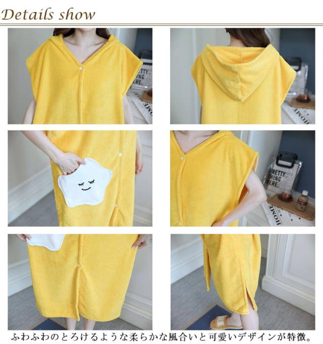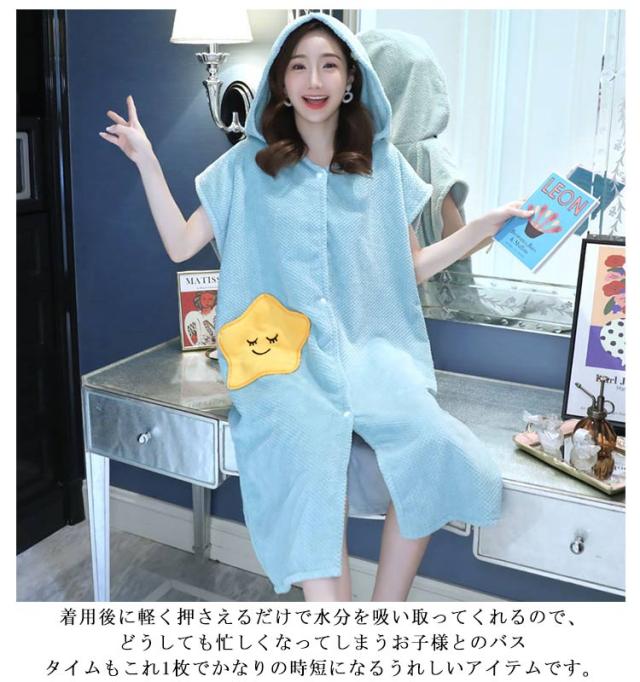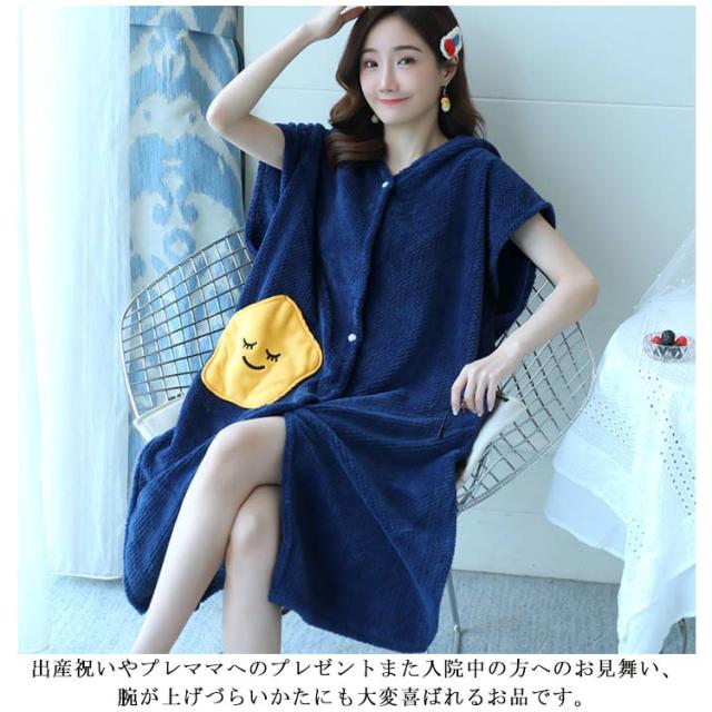 | お風呂から上がって体を拭かずにサッと着るだけ。 大人気の吸水速乾タオルの素材で作ったフード付きバスローブ。 ふわふわのとろけるような柔らかな風合いと可愛いデザインが特徴。 着用後に軽く押さえるだけで水分を吸い取ってくれるので、どうしても忙しくなってしまうお子様とのバスタイムもこれ1枚でかなりの時短になるうれしいアイテムです。 バスローブではなくルームウェアや部屋着、パジャマとしてももちろんお使いいただけます。 素材やデザインは季節関係なくオールシーズンお使いいただけます。 出産祝いやプレママへのプレゼントまた入院中の方へのお見舞い、腕が上げづらいかたにも大変喜ばれるお品です。 | |