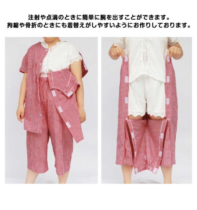 | マジックテープタイプのフルオープン夏用介護パジャマ。 注射や点滴のときに簡単に腕を出すことができます。拘縮や骨折のときにも着替えがしやすいようにお作りしております。 上着は肩から袖にかけて全開できるので、着脱がとても簡単。 拘縮や骨折のときにも着替えがしやすいようにお作りしております。たとえばの話ではありますが、転んでしまった際にできた擦り傷の治療のときにも、簡単に膝を出すことができます。 腰から裾にかけて全開できます。 おむつ替えのときにも便利な構造にお作りしております。 胸のボタンは飾りでお付けしております。ちょっとしたおしゃれも大切に想っております。 ティッシュやハンカチも入る便利なポケットをお付けしております。 | |