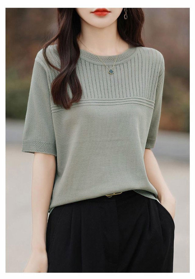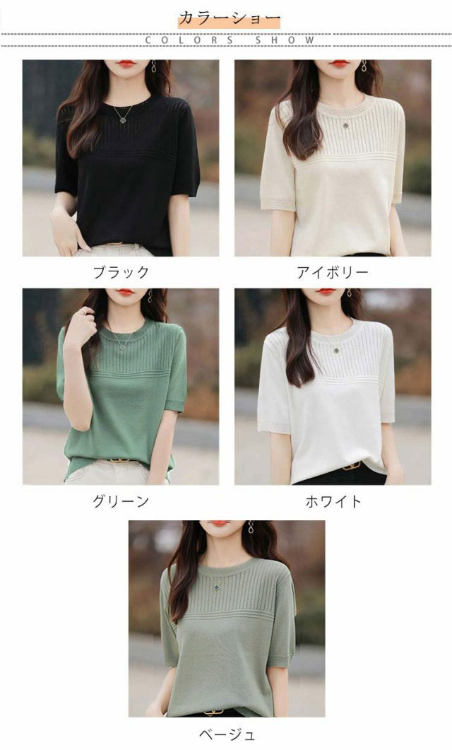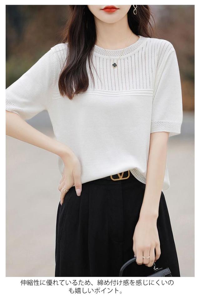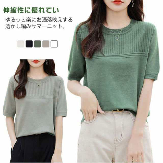 サマーニット 夏ニット メッシュニット レディース 春 夏 トップス 半袖 五分袖 プルオーバー ナチュラル 透かし編み 切替 セーター クルーネック ゆったり 体型カバー 大人 お洒落 薄手 細見え ストレッチ オフィスカジュアル