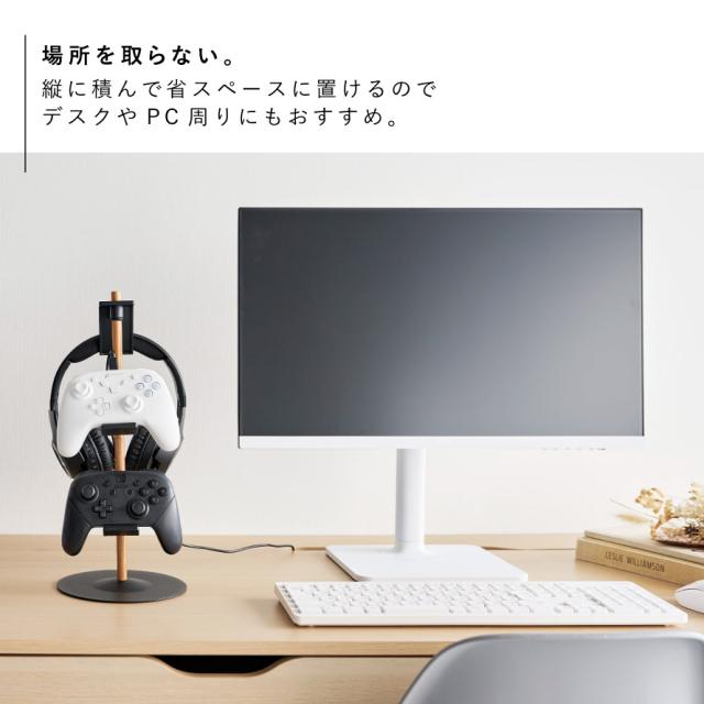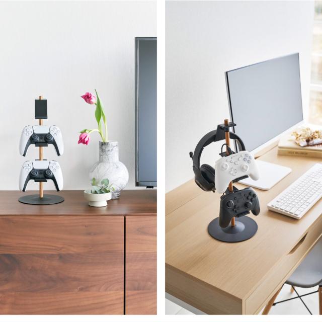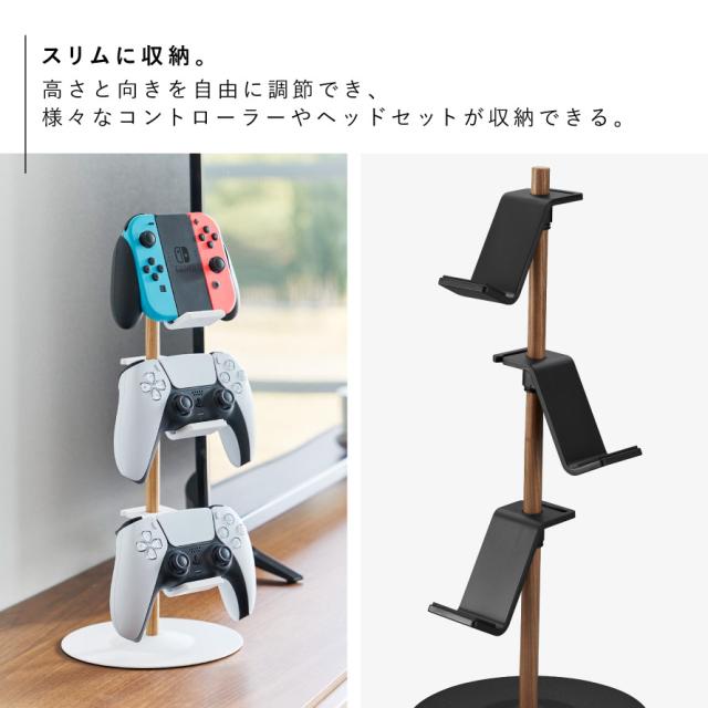 ゲームコントローラーを縦に積んでスリムに収納、置台が動く収納ラック。高さと向きを自由に調節でき、様々な種類のコントローラーやヘッドセットが収納できます。