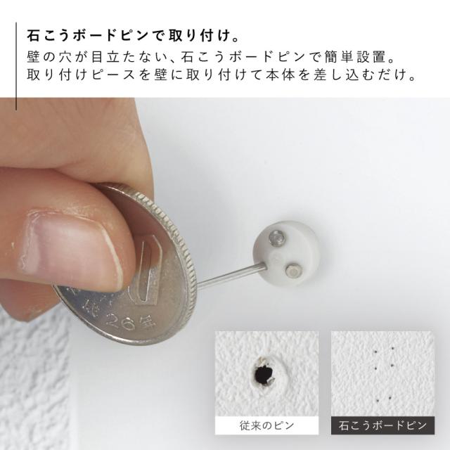 ■取り付け可能な壁面:石こうボードピン使用時/壁紙・布壁紙・ビニール壁紙貼りなどの石こうボード・薄ベニヤ、木ネジ使用時/柱・板壁(厚さ1cm以上)・プリント合板(裏側に水平にサンがある場所)・裏に下地材(間柱)が入っている壁
