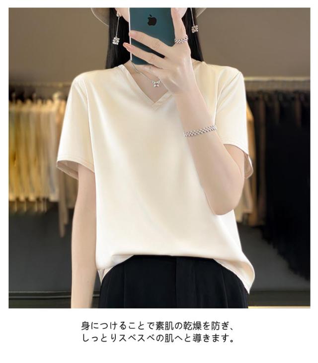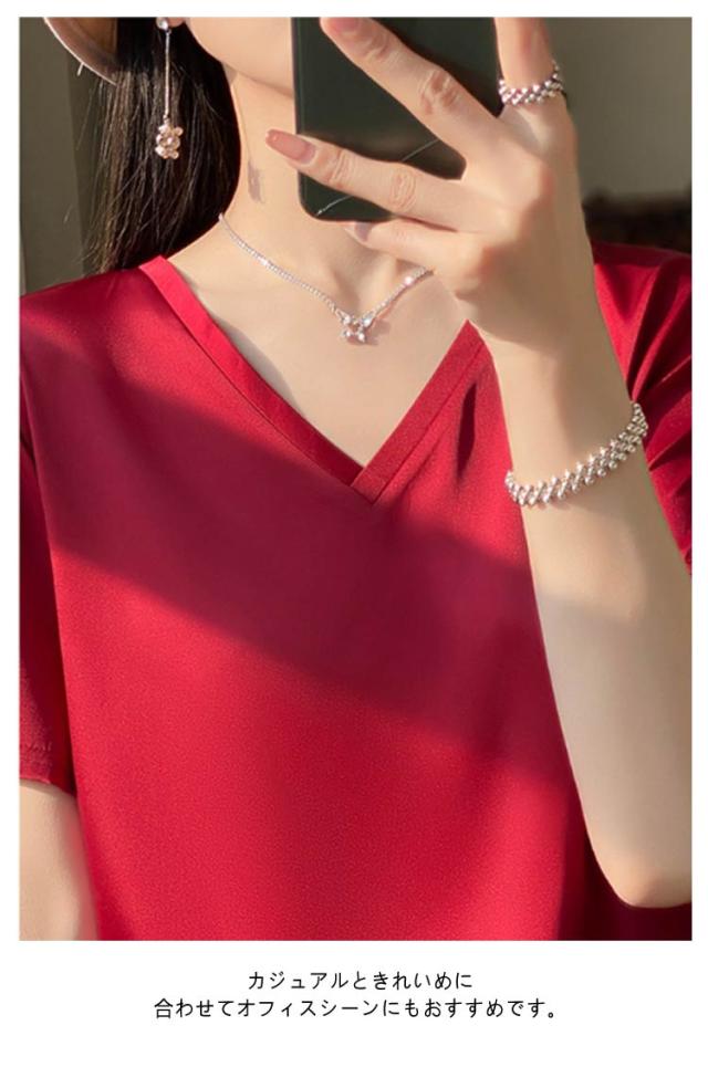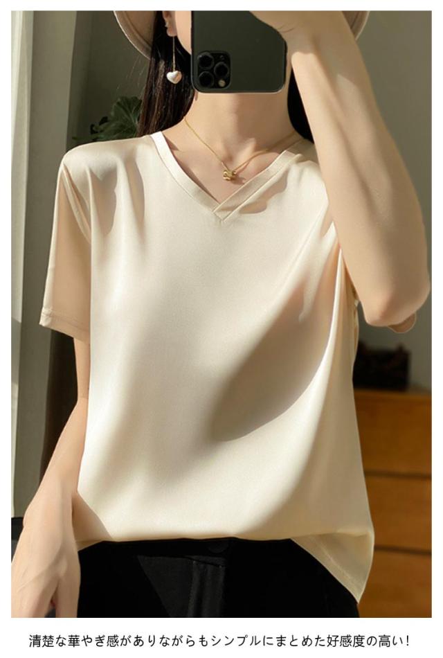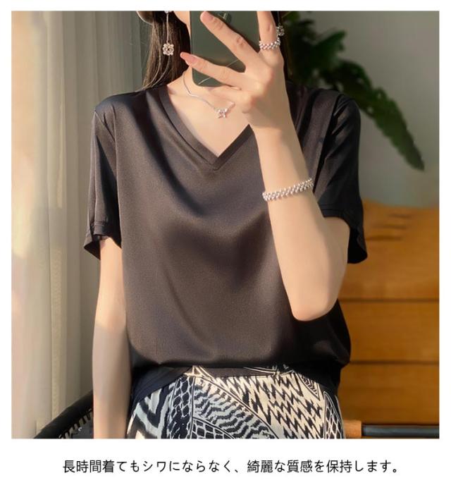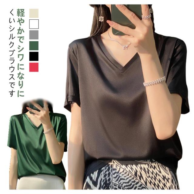 シャツ シルク ブラウス 半袖 レディース 夏 tシャツ サテン プルオーバー Vネック シャツブラウス トップス 体型カバー インナー 大きいサイズ 薄手 吸湿 通気性 速乾 敏感肌 光沢感 透けない 肌着 大人 きれいめ 高品質 肌に優しい 上品 黒 白