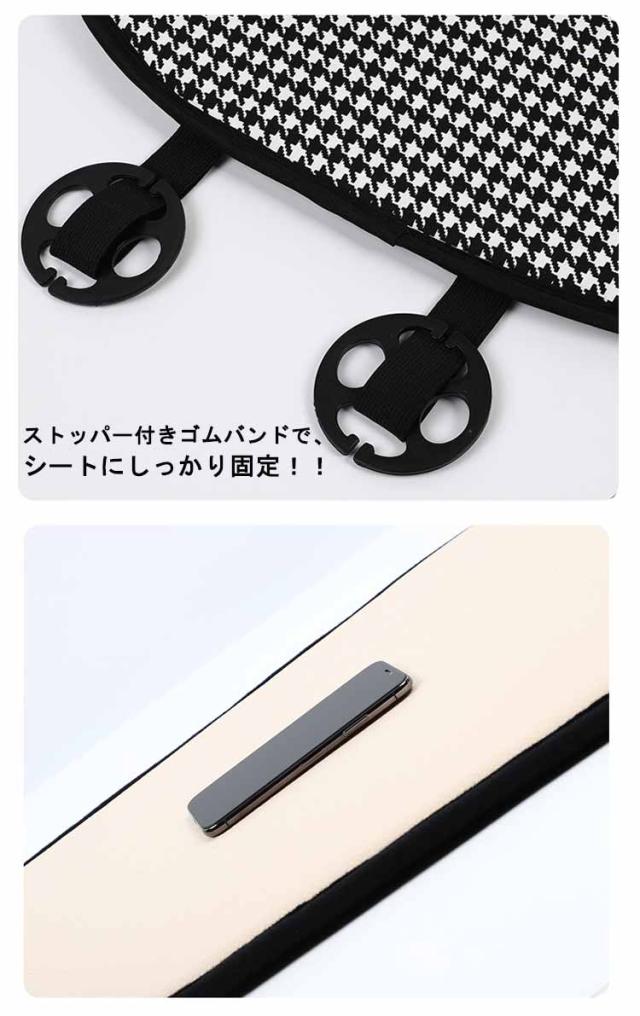 | 2点セット!シートカバー(前座席用)+背もたれ ストッパー付きゴムバンドで、シートにしっかり固定!! 表面のデザイン部分は綿で優しい肌触り。 丸ごと水洗いできるのでお手入れも簡単です。 | |