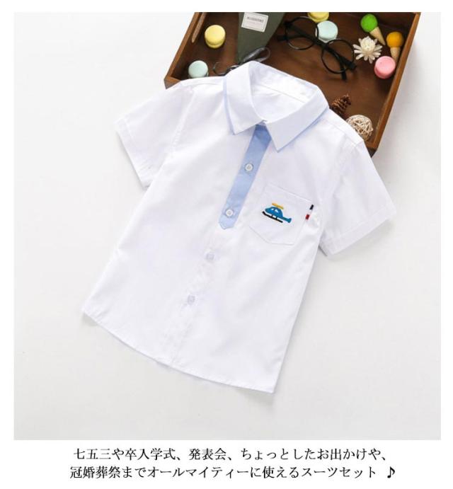 | 子供用半袖シャツ。 着心地や肌触りの良いコットン生地でさらっと快適♪ 普通着としてもお洒落です!☆ 七五三や卒入学式、発表会、ちょっとしたお出かけや、冠婚葬祭までオールマイティーに使えるスーツセット ♪ サイズも取り揃えておりますので、ご安心ください! | |