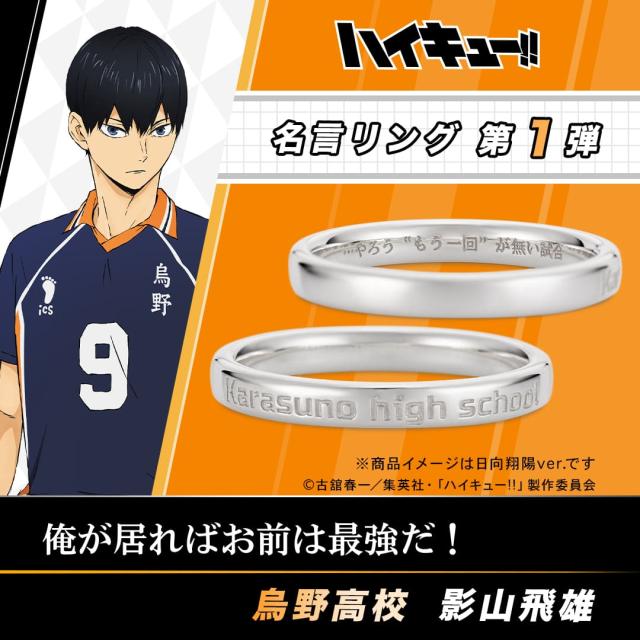『烏野高校(Karasuno high school)』の校名をデザインしたリングの内側に、印象的なエピソードがよみがえる各キャラクターの名言を刻みました。