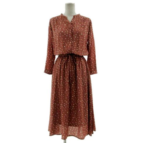 | 仕様 | バンドカラーロングワンピース 11012 長袖 ウエストゴム リボンベルト ドット フロントハーフボタン留め |