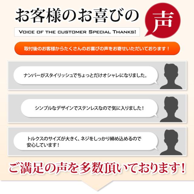 ■取付の際に起きたキズ・破損等に対する保証はございません。 ■装着のナンバーボルトを取り外しの際はプラスドライバーなどの工具が必要になります。 ■ボルト締めつけ時に力を入れ過ぎると、ボルトやナンバープレートが破損する場合があります。 |