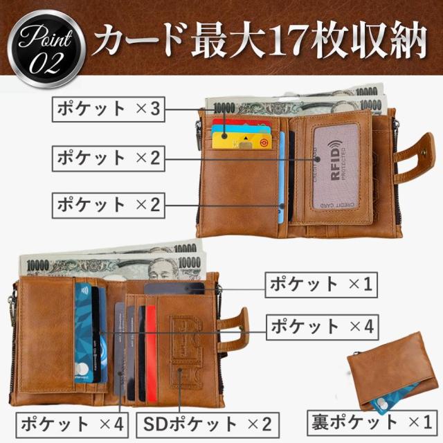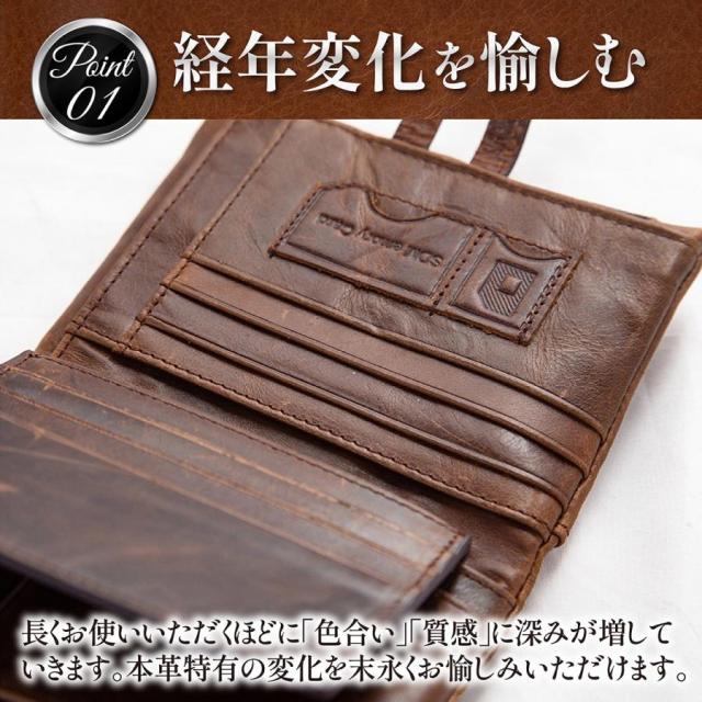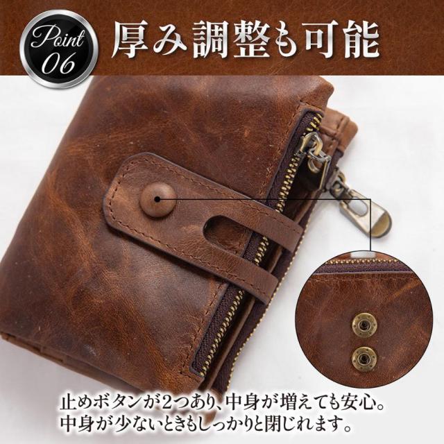 この本革製の二つ折り財布は、ファスナーや大容量の収納スペース、小銭入れ、そしてコンパクトなデザインが特徴です。男性に最適なミドルウォレットとして、札入れもしっかりと備えつつ、使い勝手の良さを重視しています。