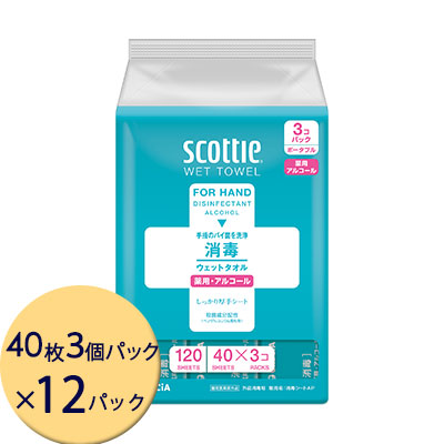 [取寄] クレシア スコッティ ウェットタオル 消毒 アルコールタイプ 40枚 3コパック×12パック ウエット ティッシュ 送料無料 01839