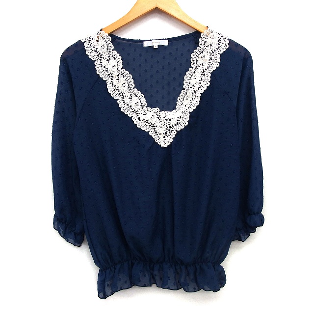 【中古】グローブ grove カットソー ブラウス シースルー ドット 柄 切替レース ラグランスリーブ 七分袖 Vネック M