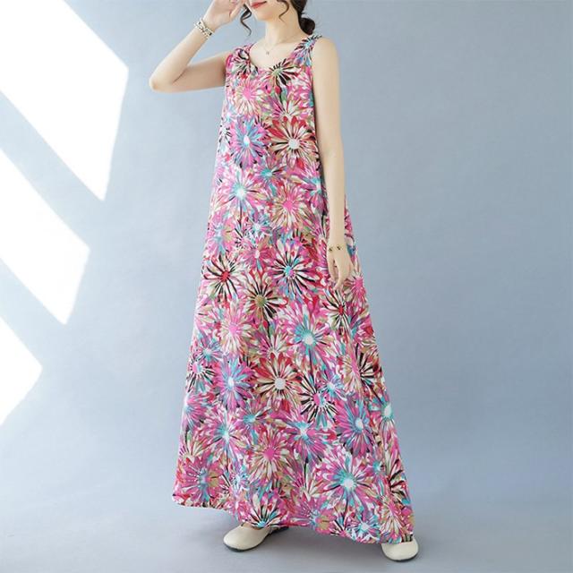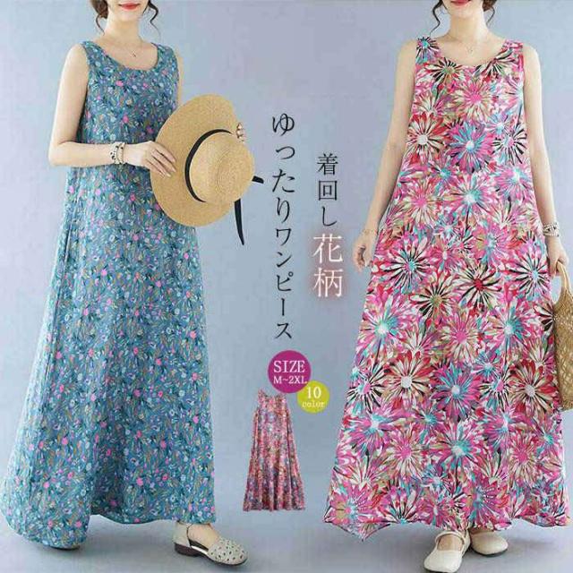 ワンピース レディース 夏 ノースリーブ リネンワンピース マキシ丈 リゾート 花柄 綿麻風レディースファッション ワンピース