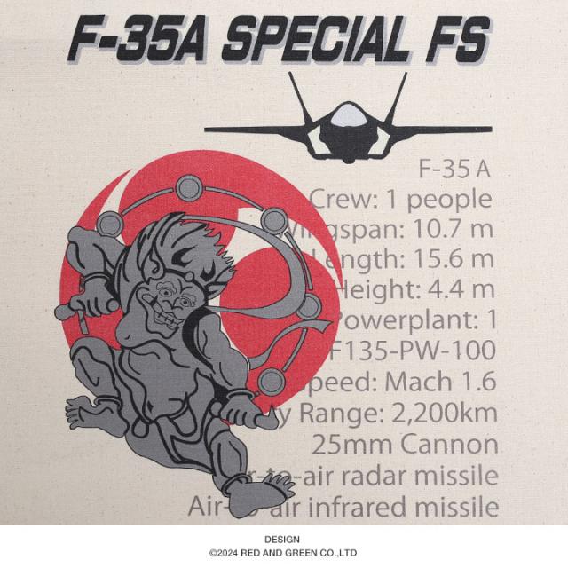 F-35の愛称「ライトニング/稲妻」にちなんだ「雷神」と「赤い三つ巴」と共に、「F-35A」の勇姿と主要諸元を落とし込み、フルカラープリントで表現したスペシャル感漂う仕上がり。