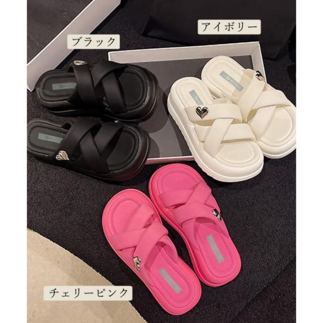 夏っぽいチェリーピンクを含めたブラックとアイボリーの3色展開の厚底ミュールサンダル。