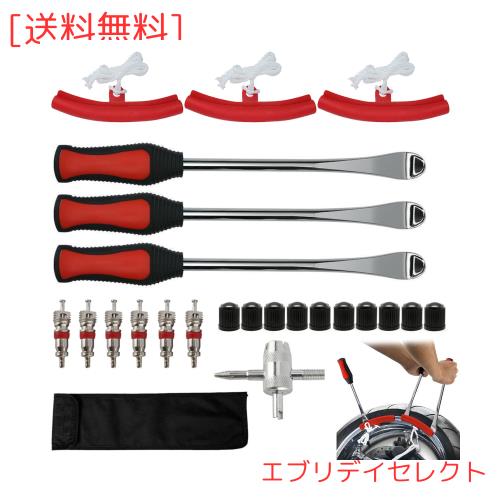 ? 【大満足の23点セット】:セット内容:タイヤレバー*3点、リムプロテクター*3点、バルブコア*6点、多機能バルブコアレンチ*1点、タイヤバルブキャップ*10点、収納袋付き、タイヤ交換を手組みでする際に必要なセットが揃っています。