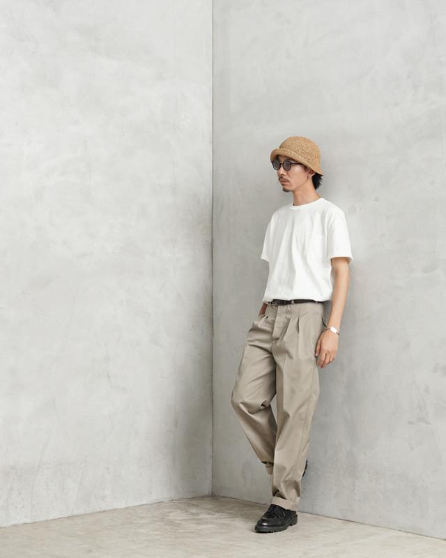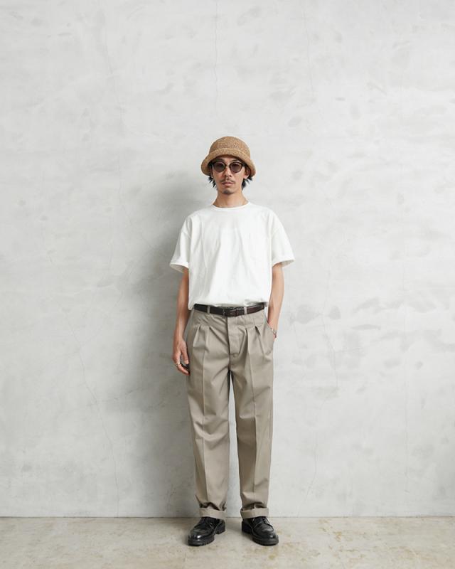 ドイツ製のツータック チノトラウザーズが入荷しました。1980〜90年代頃のアイテムで、フランス軍の「M-52 ツータック チノトラウザー」のような雰囲気を感じさせるバックポケットやウエスト周りのデザインです。フロントはボタンフライ仕様で両サイドには両玉縁のハンドポケット、バックポケットはボタン開閉のフラップポケットが付属しています。シルエットは腰回りにゆとりのあるキレイなテーパードシルエット。さらっとした質感でハリもある丈夫で汚れにくいT/Cツイル生地が使用されています。T/Cツイルは速乾性に優れ、シワになりにくく、タフでイージーケアできる素材感でデイリーユースにも最適です。