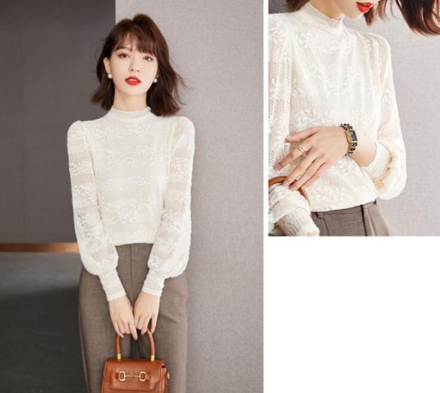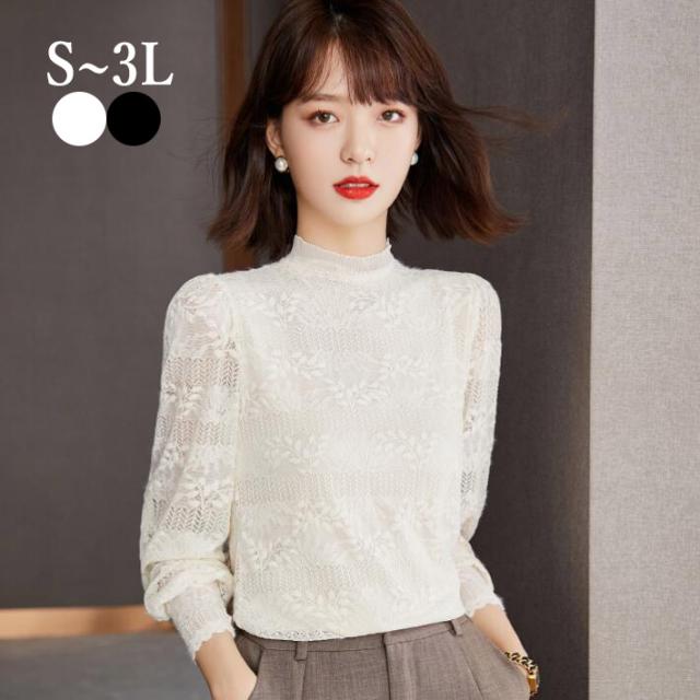 レース ブラウス花柄ブラウスシースルー花柄インナー立ち襟ハイネックトップス レディースカットソーバルーンスリーブフリルネック大きいサイズ長袖 透け春秋SML2L3L