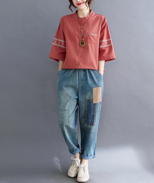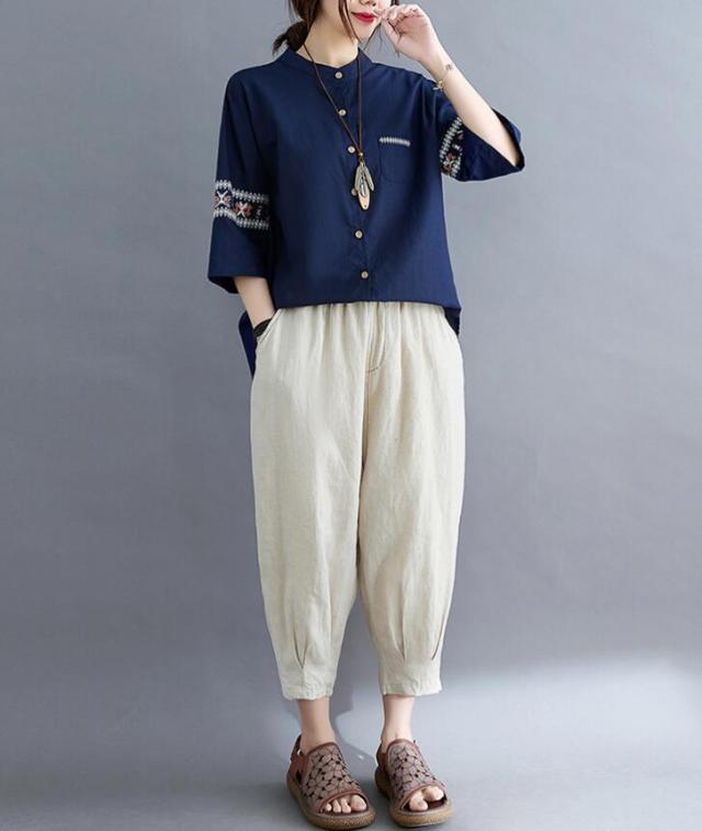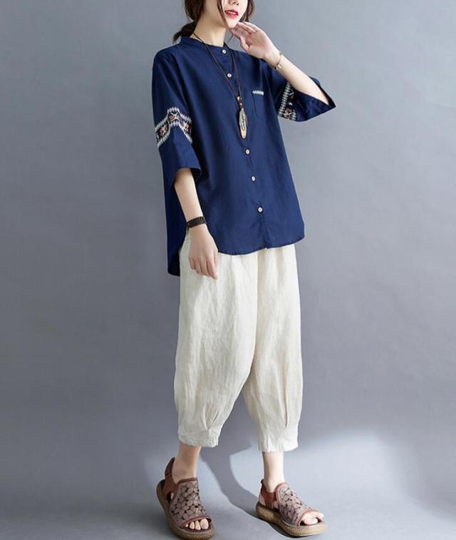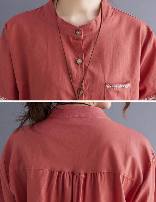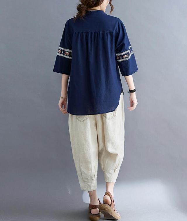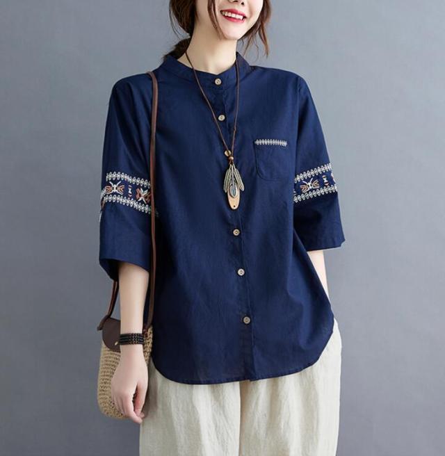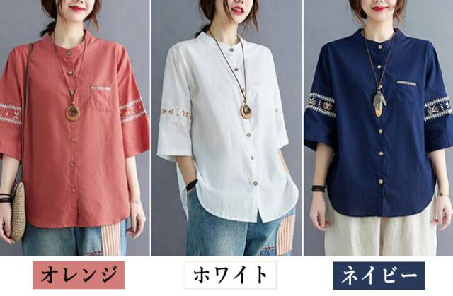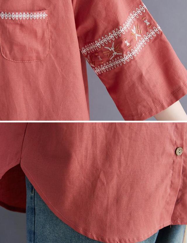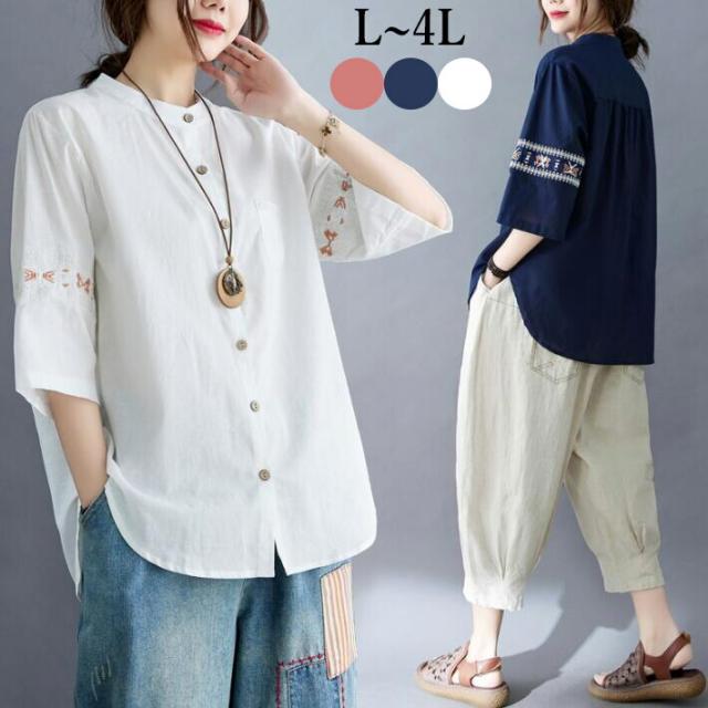 シャツレディース刺繍花柄綿麻風トップス半袖5分袖 大きいサイズカジュアル オフィス おしゃれ OL 可愛いLLL3L4L