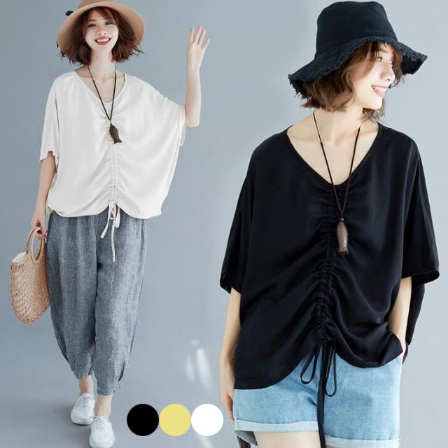 ドルマンTシャツドルマンドレストリボン ギャザーVネックロングTシャツオーバーサイズ チュニック5分袖半袖ロング 大きいサイズクルーネックビッグシルエット体型カバー