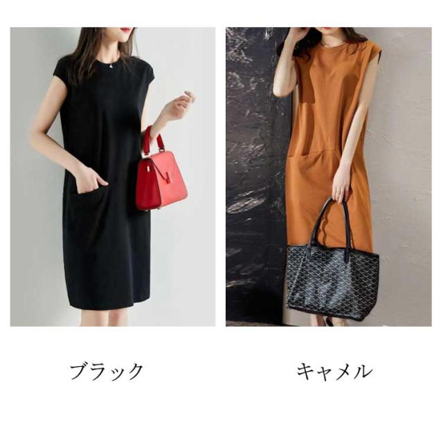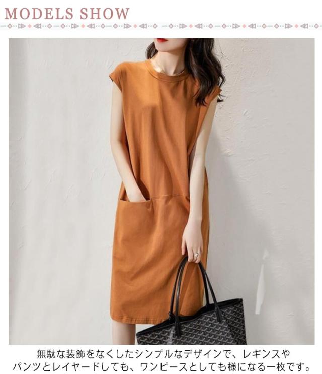 ノースリーブワンピース ひざ丈 Tシャツワンピース ロンT チュニックワンピース ポケット付き 丸首 フレンチスリーブ ワンピース カットソー レディース 春夏 ミニワンピース 無地 ルームワンピース 通気性 吸湿速乾 体型カバー 送料無料