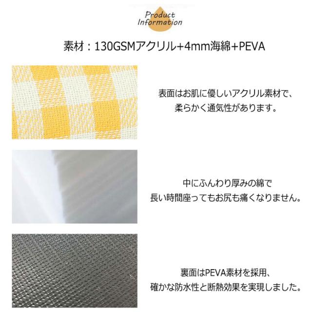 ふんわり厚みのある生地で座り心地もよく快適。裏地は防水仕様で水を通さないので湿った土の上でも安心です。
