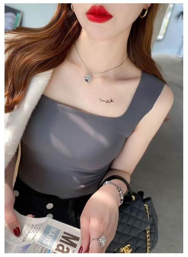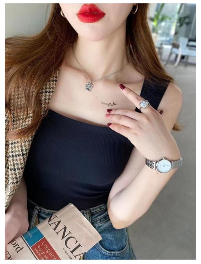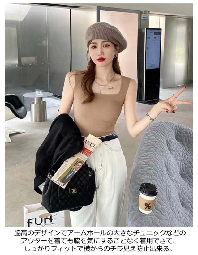 | 2枚セット レースや胸元の開いたお洋服など、空きのあるお洋服に様々に対応可能なタックトップ 首元まっすくなスクェアネックラインは、トップスに響かせず、美しい鎖骨を見せる 太めアップした肩紐がブラの紐をしっかり隠して、シースルートップスに合わせると、ブラ紐を気にせず可愛く着られる 脇高のデザインでアームホールの大きなチュニックなどのアウターを着ても脇を気にすることなく着用できて、しっかりフィットで横からのチラ見え防止出来る | |