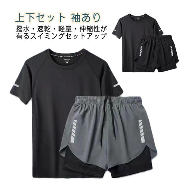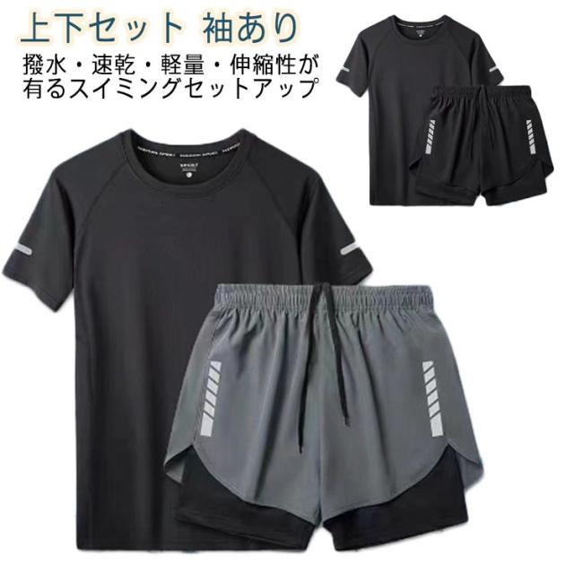 水着 メンズ 上下セット セットアップ パパ 半袖 ハーフパンツ セット ラッシュガード 大きいサイズ 袖あり かっこいい 半袖 Tシャツ 男性用 パパ水着 海パン ブラック スポーツ水着 ジム スポーツジム プール 海 ブルー 大きいサイズ 送料無料