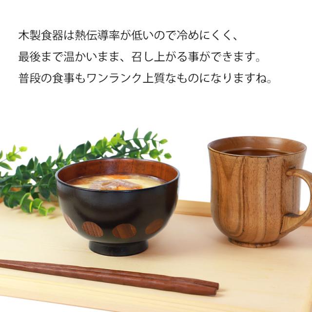 木製食器は熱伝導率が低いので冷めにくく、最後まで温かいまま、召し上がる事ができます。