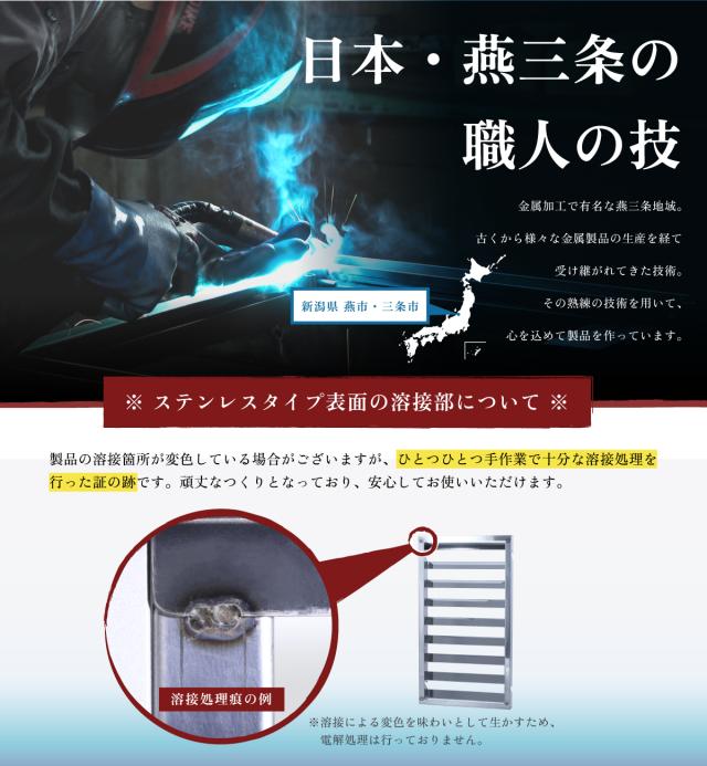 ※サイドルーバー単品での使用はできません。本体と組み合わせてご使用ください。 サビにくい性質を持つ2種類の材質から選べる室外機カバー。 ルーバー部分は太陽高度を基に計算し設計。中心を折ることにより強度を高めています。 また、ルーバーは大きな口型フレームで一体化しているため、組立が簡単。さらにフレームが補強となり、安定性に優れます。 生産は金属加工で実績のある日本・燕三条地域で行っており、職人が一つひとつ手作業で作成しています。 ※溶接部に焼き色がついている場合がございますが、しっかりと溶接を行った証となっており、安心してお使いいただけます。 【選べる2種類の材質】 ■ZAM鋼板 高耐食性の溶融亜鉛-アルミニウム-マグネシウム合金メッキ鋼板。マグネシウムとアルミニウムの効果により、優れた耐食性、耐キズ付き性を実現した素材です。高級外壁材や、公共工事の屋外材として使用される実績のある素材です。 ■ステンレス 水回りによく用いられることで知られるステンレス。優れた耐食性、耐熱性や強度をもつ素材です。メンテナンスも容易で、リサイクルできるため環境にやさしい素材となっております。 |