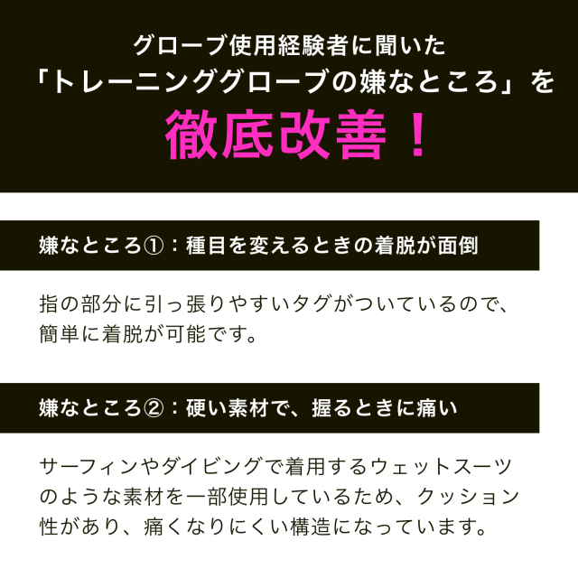 ・重いウェイトや器具を扱う際に、手のひらや指にかかる摩擦や圧力を軽減し、まめやすり傷から手を保護します。