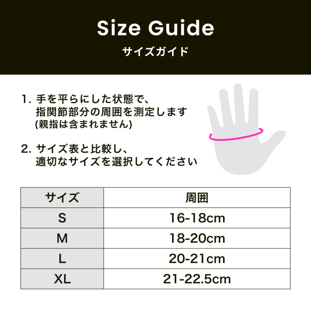 ユニセックスで性別問わず使ってもらえるように、S.M.L.XLと幅広サイズ展開でご用意しております。 ご自身の手のひら周りのサイズに合わせてご購入いただけます。 (手のひら周りサイズ: S 16-18cm、M 18-20cm、L 20-21cm、XL 21-22.5cm)