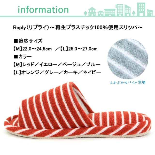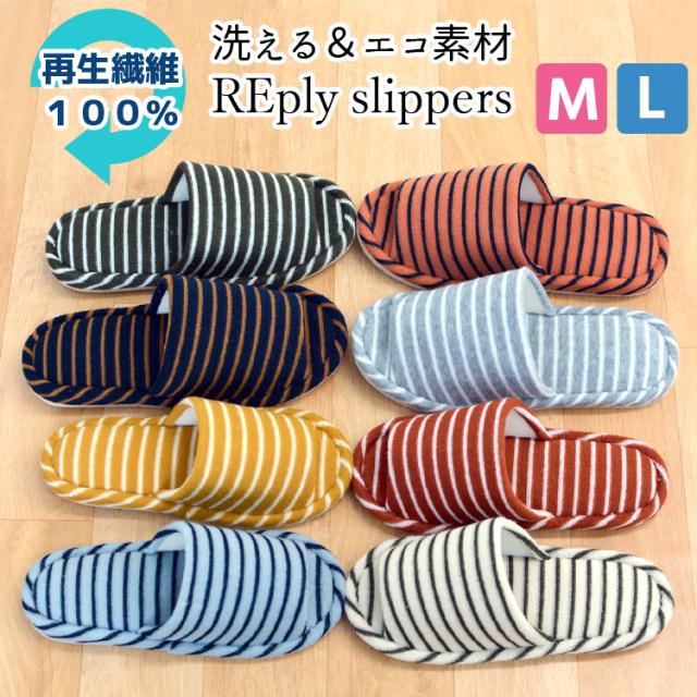 プラスチック再生 スリッパ 洗える エコ SDGs REply リプライ パイルボーダー 外縫い 前空き おしゃれ メンズ レディース 来客用 春夏用 秋冬用 オールシーズン ルームスリッパ 軽くて柔らか 部屋履き 再生プラステック100%のスリッパです! agesugi_snk