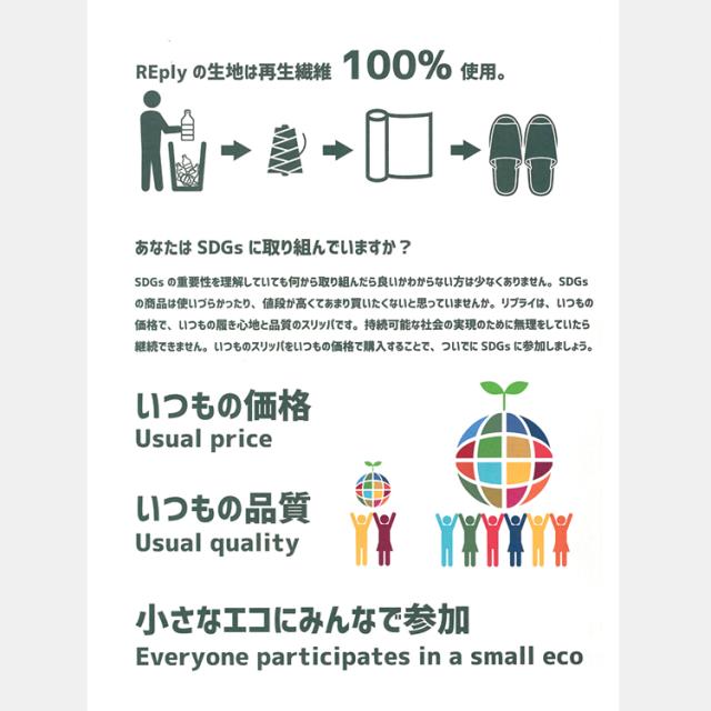 あなたはSDGsに取り組んでいますか?REplyは、いつもの価格で、いつもの履き心地と品質のスリッパです。持続可能な社会の実現のために無理をしていたら継続できません。いつものスリッパをいつもの価格で購入することで、ついでにSDGsに参加しましょう。