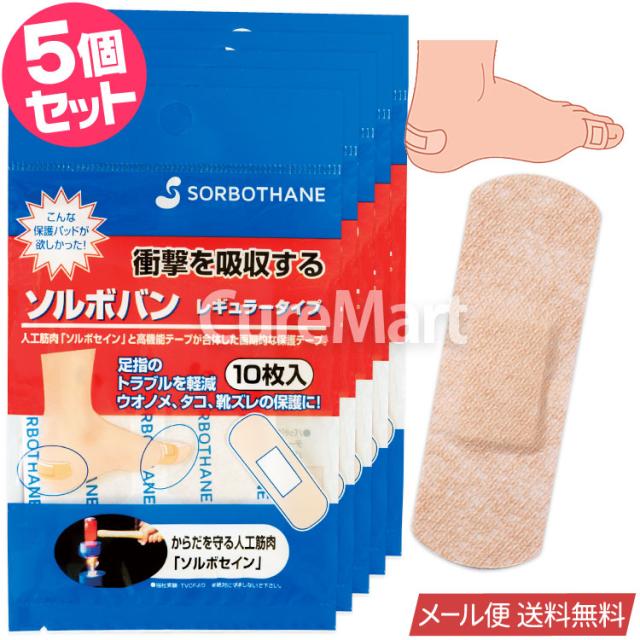 ソルボバン レギュラータイプ 10枚入◆5個セット 60099 日本製 sorbothane ソルボセイン メール便 送料無料 水に強い 靴ずれ防止 マメ タコ うおのめ 魚の目 パッド 保護シール 通気性 伸縮性 ばんそうこう SORBO 三進興産