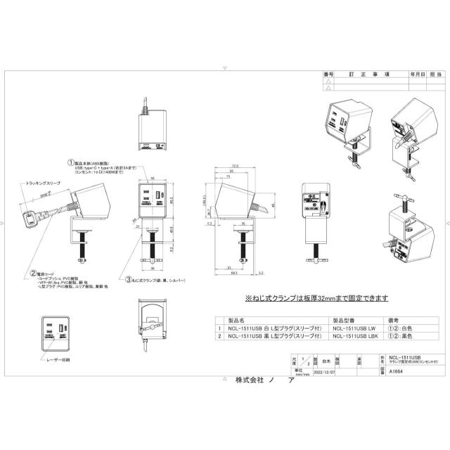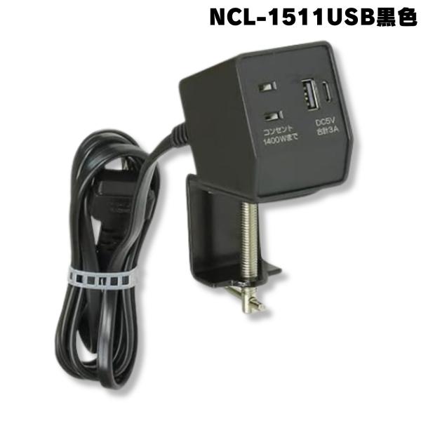 ノア NCL-1511USB LBK 什器用 固定式マルチコンセントタップ 1ヶ口コンセント 1400Wまで USBコンセント