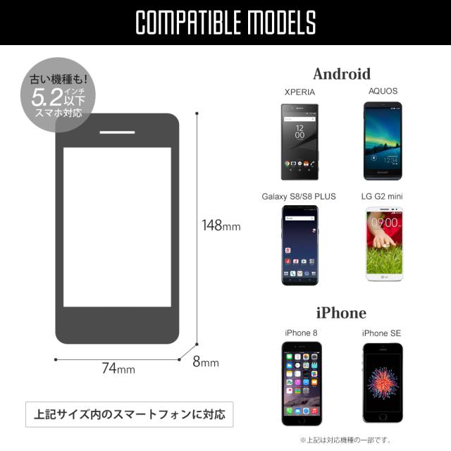 ■対応最大サイズ:約74(W) × 8(D) × 148(H) mmまでのスマートフォン