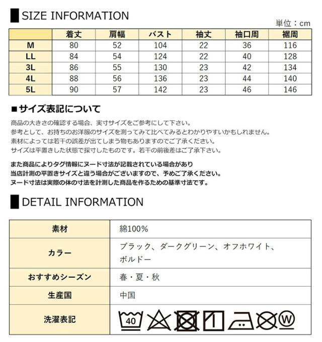 5L:着丈90 肩幅57 バスト142 袖丈23 袖口周46 裾周146