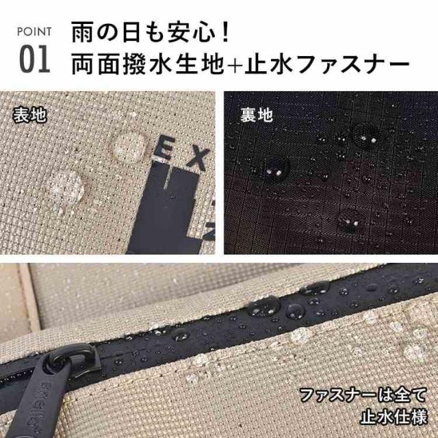 両面撥水生地と止水ファスナー仕様。濡れてもさっと拭き取れ、雨の日でも気兼ねなく使えます。