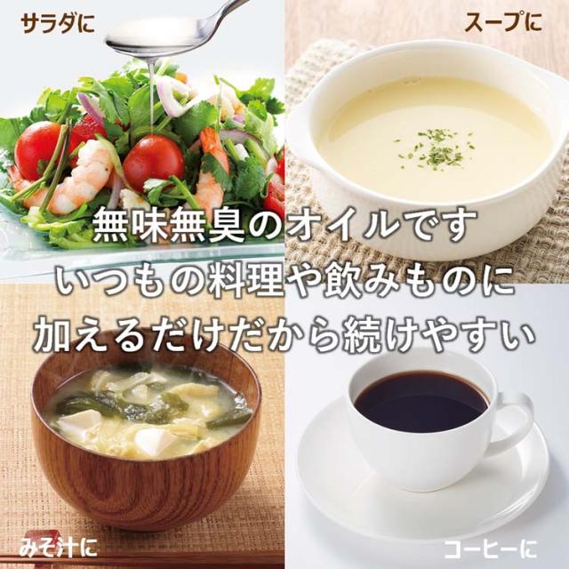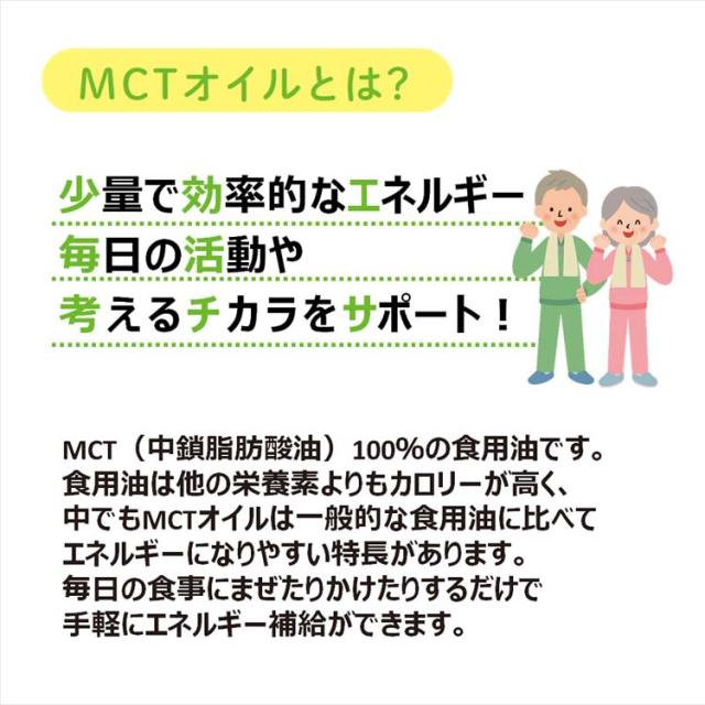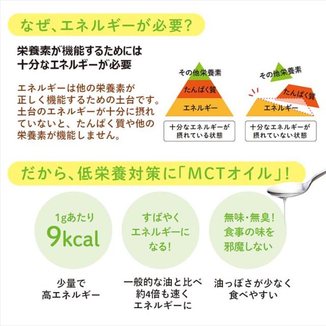 | 小さじ1杯(4.6g)当たり 熱量:41kcal、たんぱく質:0g、脂質:4.6g、炭水化物:0g、食塩相当量:0g、中鎖脂肪酸油、4.6g |