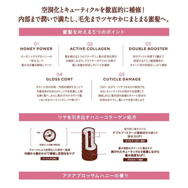 ●髪内部の水分量を保持するオーガニックマヌカハニー*1や、髪ダメージをケアする3種のコラーゲン*2など、髪本来の輝きを魅き出す美髪成分を厳選して配合。