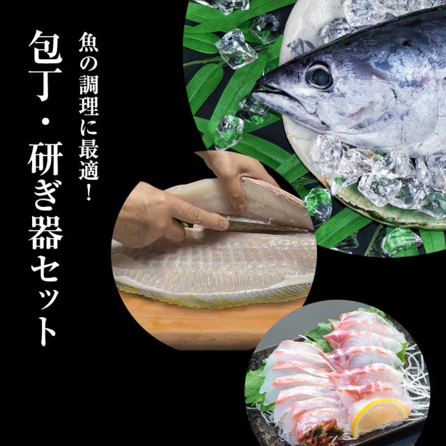 魚の頭落としもサクッとこなせる「出刃」、小ぶりな魚の3枚おろしもスムーズに行える「小出刃」、魚の切り身やサクも美しく引き切ることができる「刺身包丁」の3点が付きます。